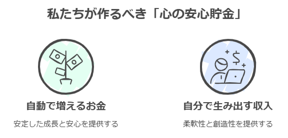 私たちが作るべき「心の安心貯金」は、「自動で増えるお金」と「自分で生み出す収入」という、2つの支えで成り立っています。